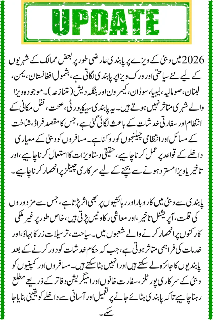 The Dubai visa ban in 2026 is temporary and affects certain countries due to security, health, and document compliance concerns. Travelers from affected nations may face delays in visa approvals, work permits, and travel plans. Nationals with existing visas are not affected. It is important to rely on official Dubai channels, use genuine documents, and stay updated on immigration rules.